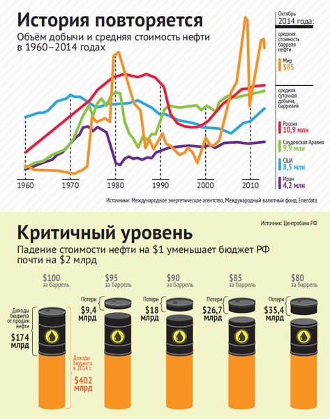 Ситуация 2014-го вплоть до подробностей совпадает с развитием событий вокруг цен на нефть во времена, предшествовавшие падению СССР, — в середине 1980-х. Но чтобы оценить эти совпадения, стоит заглянуть еще глубже — в 1960–1970 годы прошлого века.