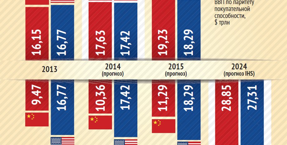 По-настоящему догнать США у Китая получится лишь к 2024 году — только тогда, по оценке аналитической организации IHS, номинальный ВВП Китая достигнет $28,6 млрд, опередив американский ($27,3 млрд). Но этого может не случиться.