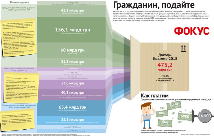 Бюджет на 2015 год почти на четверть больше прошлогоднего: 475 млрд грн против 377 млрд. Большую часть из дополнительных почти 100 млрд грн заплатят обычные граждане.