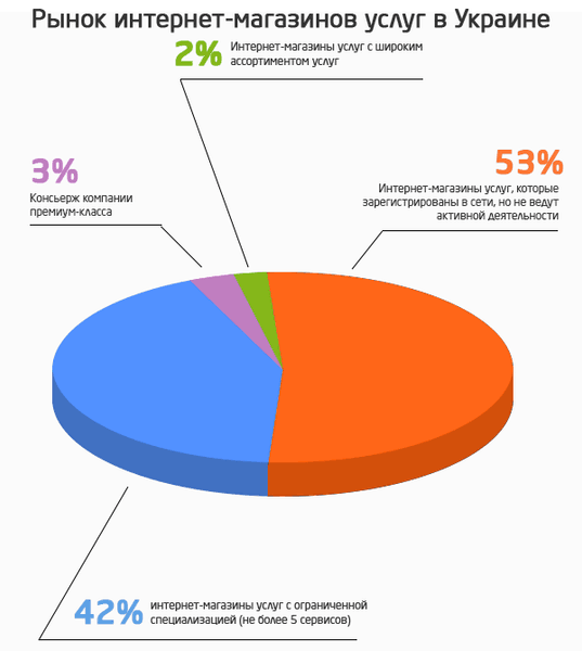 В период с 2013 по 2015 год на территории Украины возникло более 1 тысячи различных интернет-магазинов услуг. По факту, лишь половина из них ведет активную деятельность. Эти компании предлагают клиенту не более 4-5 видов услуг в одном или нескольких узких сегментах рынка. И только 5% из них официально называют себя интернет-магазинами услуг, в число которых входит MYService.