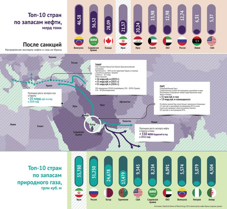 Кстати, о Газпроме: если падение цен на нефть нанесет по российскому монополисту косвенный удар, то рост добычи газа ударит по нему непосредственно. Хотя и в более удаленной перспективе. Иран располагает крупнейшими в мире запасами природного газа: почти 34 трлн кубометров (18% мирового объема). В Тегеране уже заявили, что готовы стать "надежным поставщиком" газа на традиционный газпромовский рынок — в страны ЕС. Сделать это можно по строящемуся трансанатолийскому газопроводу TANAP (азербайджанская государственная нефтяная компания SOCAR рассматривает предложение по продаже Ирану части своей доли в TANAP - ред.), который пройдет от Каспия через территорию Турции в Грецию и далее в Европу — окончание проекта запланировано на 2018 год.