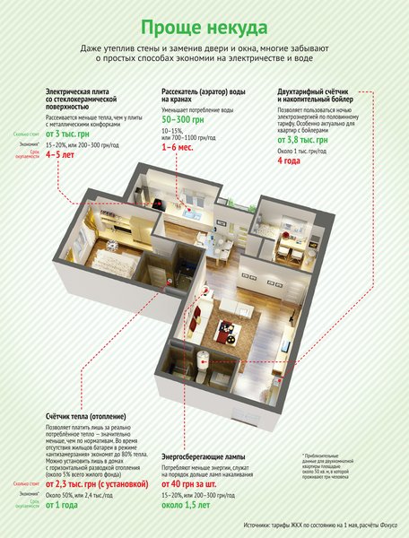 Сократить плату за коммунальные услуги в отдельно взятой квартире можно и не прибегая к столь радикальным методам (см. Проще некуда). К примеру, эксперт по энергоэффективности Алексей Хабатюк рекомендует перейти на двухзонный тариф учета электроэнергии. В этом случае потребитель с 23 до 7 часов оплачивает электричество по половинному тарифу. То есть 18 копеек за кВт при потреблении до 100 кВт в месяц, и по 32 копейки при потреблении от 100 до 600 кВт. Главные потребители электроэнергии — холодильник, который работает на протяжении суток, и стиральная машина, которую можно запускать ночью. В целом, только переход на двухзонный тариф может сэкономить на электричестве до 40%.