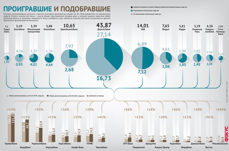 С начала 2014 года в Украине обанкротился 51 банк. Размещенные в этих финучреждениях депозиты населения, не превышающие 200 тыс. грн, сегодня компенсирует Фонд гарантирования вкладов физлиц (ФГВФЛ). Сумма, которую должны получить клиенты банков-банкротов, к июлю 2015 года достигла 58 млрд грн. Но большую часть этих средств вкладчикам уже вернули. По данным ФГВФЛ, еще до начала лета клиентам 40 лопнувших финструктур выдали 30,1 млрд грн. А в июне 2015-го стартовали выплаты вкладчикам двух крупных финучреждений — Дельта Банка (общая сумма компенсаций — 16,73 млрд грн) и банка "Киевская Русь" (2,45 млрд грн).