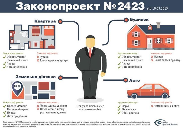 Закон также значительно упрощает процедуру поиска спрятанного от общественности имущества чиновников. Если раньше это делалось исключительно по объекту недвижимости, теперь найти информацию можно по фамилии госслужащего. Правда, в ответе на такие запросы точный адрес объекта недвижимости указываться не будет, поскольку даже чиновники имеют право на защиту персональных данных. Вместо этого будет указано название области, города и района, где расположено имущество госслужащего.