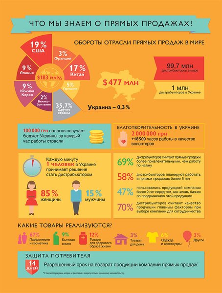 — Прямые продажи в Украине — это отрасль с оборотом порядка 4 млрд грн, а компании отрасли — крупнейшие налогоплательщики страны, которые пополняют госбюджет на 900 млн грн ежегодно. И, что самое главное, эта отрасль стабильная, и в этом году она уверенно растет. За первые шесть месяцев 2015-го она выросла на 37% по сравнению с тем же периодом прошлого года. Компании показывают прирост продаж не только в деньгах, но и в единицах товаров, что еще более показательно.