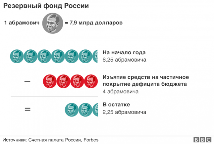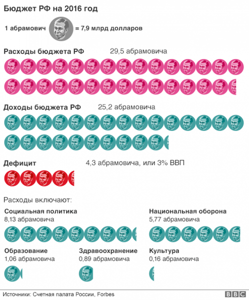 Исходя из опубликованной инфографики, в 2016 году расходы федерального бюджета РФ утверждены на уровне 29,5 абрамовичей, дефицит - 4,3 абрамовича.
