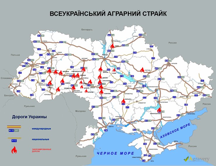 28 декабря в 9 утра украинские аграрии перекрыли большинство центральных трасс страны и объявили Всеукраинскую аграрную забастовку. Заблокированы трассы Киев — Одесса, Хмельницкий — Винница, Хмельницкий — Тернополь, Харьков — Симферополь в Запорожской области, Антоновский мост через Днепр в Херсонской области и граница Черновицкой области в Святыне. В акции участвуют сотни аграриев из Киевской, Николаевской и Тернопольской областей. Они вывели на дороги тяжелую сельхозтехнику и разрешают проехать только военным, автобусам с детьми и машинам, в которых находятся беременные женщины.