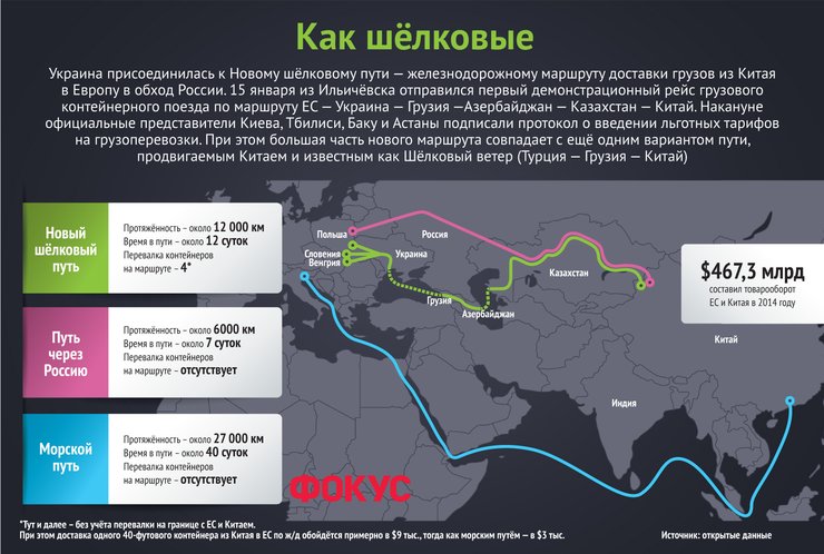 15 января из Ильичевского порта отправился первый контейнерный поезд в Китай. Его маршрут пройдет по транскаспийскому коридору, так называемому Новому шелковому пути — через Черное море, Грузию, Азербайджан, Каспийское море и Казахстан. Доставка контейнерных грузов до границы с Китаем по этому маршруту занимает около 11 дней. При этом перевозка стандартного "двадцатифутового" контейнера от границы Китая до Чопа обходится около $8 тыс. Перевозка такого же груза через территорию России занимает 9 дней и стоит вдвое дешевле. Впрочем, украинские экспортеры рады и такой альтернативе. После того как президент РФ Владимир Путин 1 января де-факто запретил транзит украинских грузов через территорию России, транскаспийский путь стал достаточно привлекательным маршрутом поставок товаров в Среднюю Азию и Западный Китай.