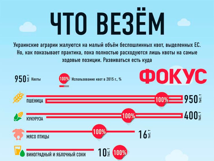 Главная жалоба аграриев на соглашение о свободной торговле с ЕС — слишком малый объем квот на беспошлинный ввоз. К примеру, ЕС позволяет беспошлинно ввозить лишь 400 тыс. т кукурузы, в то время как в прошлом году украинские аграрии собрали 23 млн т этой культуры. Похожая ситуация со всеми "ходовыми" продуктами украинского экспорта — зерновыми культурами, подсолнечным маслом, курятиной и яйцами. Квоты на них исчерпываются за несколько дней. За основные объемы поставляемой продукции приходится платить таможенные пошлины. Минагрополитики неоднократно пытался договориться с европейской стороной об увеличении квот, однако результатов эти переговоры не принесли. "Пока нет планов предоставлять Украине дополнительные увеличенные квоты", — говорит еврокомиссар по вопросам торговли Сесилия Мальмстрем. У еврочиновников есть формальное оправдание: многие квоты вообще не используются. К тому же в 2014 году ЕС вводило дополнительные квоты на поставки курятины, а в 2015 году — яиц, но они оказались не востребованы.
