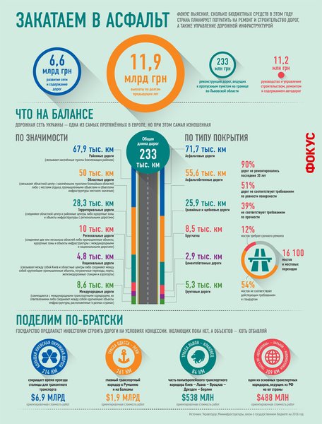 Государственная целевая программа развития автодорог на 2013–2018 гг. предполагала выделение на реконструкцию инфраструктуры $17 млрд бюджетных средств, а также привлечение около $10 млрд кредитов. Но из-за недостаточного финансирования она выполнена лишь на 20%. Так, в этом году из бюджета на реконструкцию дорог планировалось направить 26 млрд грн, но по факту предусмотрено всего четверть этой суммы. По оценке директора Центра транспортных стратегий Сергея Вовка, денег хватит на нормальный ремонт лишь 600 км дорог, то есть в реальности дорожники снова будут "латать дыры".