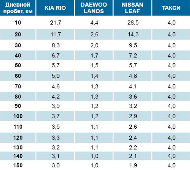 На маршрутах короче 70 км конкурировать по экономичности с такси может разве что старенький Lanos на газу. Но, с другой стороны, большая часть эконом-такси использует машины того же класса. К тому же в случае такси нельзя быть уверенным в профессионализме водителя и в том, что машину подадут в нужное время.