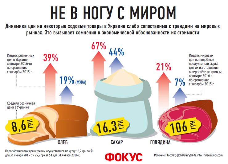 Цены на сахар тоже под подозрением. В Украине за год он подорожал на 67%, до 16,3 грн за килограмм, в то время как на мировых рынках поднялся в цене всего на 44% — в гривневом эквиваленте до 8,6 грн за кг. Правда, разницу можно отчасти объяснить сокращением производства сахара в Украине. В прошлом году оно упало на 30%, до 1,46 млн т.