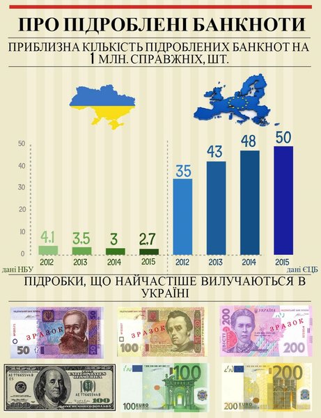 Также Нацбанк отметил, что уровень поддельных банкнот в Украине значительно ниже уровня в европейских странах, по данным Европейского центробанка. Так, согласно приведенным данным, в 2012 году ЕЦБ зафиксировал 35 поддельных банкнот на 1 млн настоящих, в 2013 году - 43 штуки, в 2014-м - 48, в 2015-м - 50.