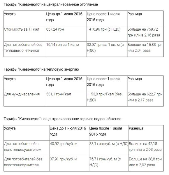 ПАО "Киевэнерго", которое отапливает в столице немало многоэтажек и подает в дома горячую воду, обнародовало новые тарифы на эти услуги с 1 июля 2016 года, сообщает "Крещатик".