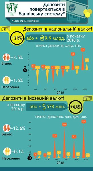 Всего за шесть месяцев выросли депозиты бизнеса. В иностранной валюте в долларовом эквиваленте – на 12,6%, или на $572 млн с начала года. В гривне – на 3,5%, или 7 млрд грн.