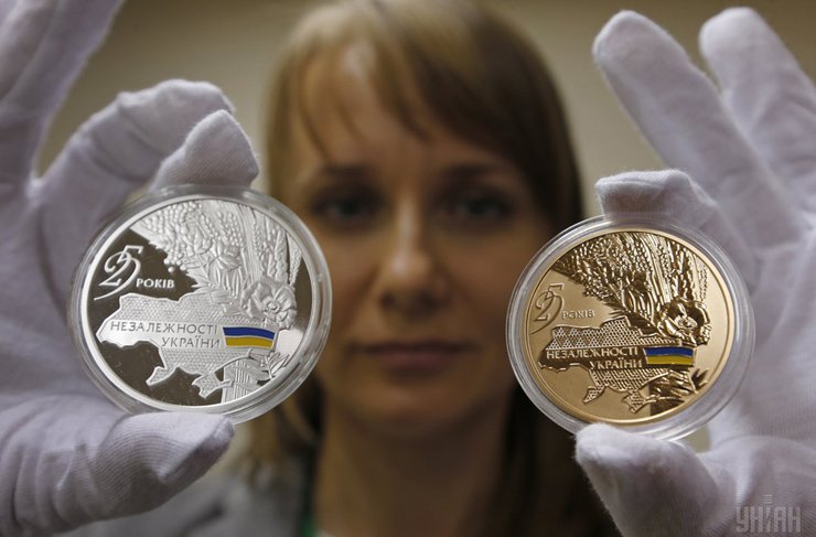 К 25-летию независимости Украины наряду с серией из четырех памятных монет из нейзильбера Нацбанк также ввел в оборот монеты номиналом 20 грн из серебра и 250 грн из золота. Тираж золотой монеты "25 лет независимости Украины" массой 62,2 г (2 тройские унции) — всего 400 экземпляров. Весь тираж планируется распродать на аукционах Универсальной товарной биржи "Контрактовый дом УМВБ". По состоянию на 1 сентября 2016 года уже состоялось два таких аукциона, на которых купили 79 монет на общую сумму 9,8 млн грн. Максимальная цена монеты достигла 173,675 тыс. грн.