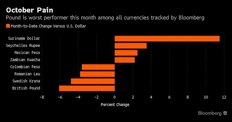 Британский фунт стерлингов в октябре показал наибольшее снижение к американскому доллару по сравнению с другими валютами, подешевев более чем на 6% — до $1,2162. Об этом сообщает УНИАН со ссылкой на Bloomberg.