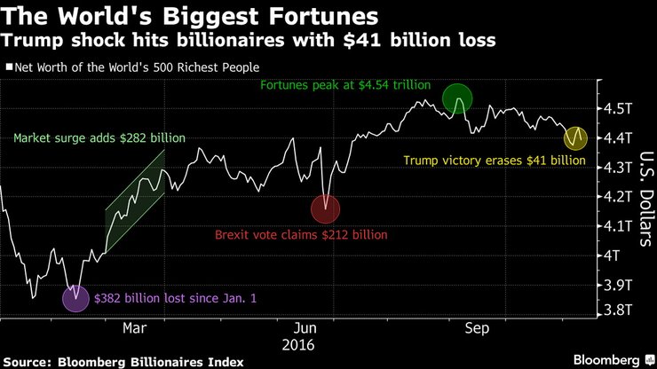 Падение индексов фактически нивелировало совокупный рост в $57 млрд самых богатых людей в мире, который произошел в начале недели, когда рынки выросли на ожиданиях, что Клинтон победит на выборах.