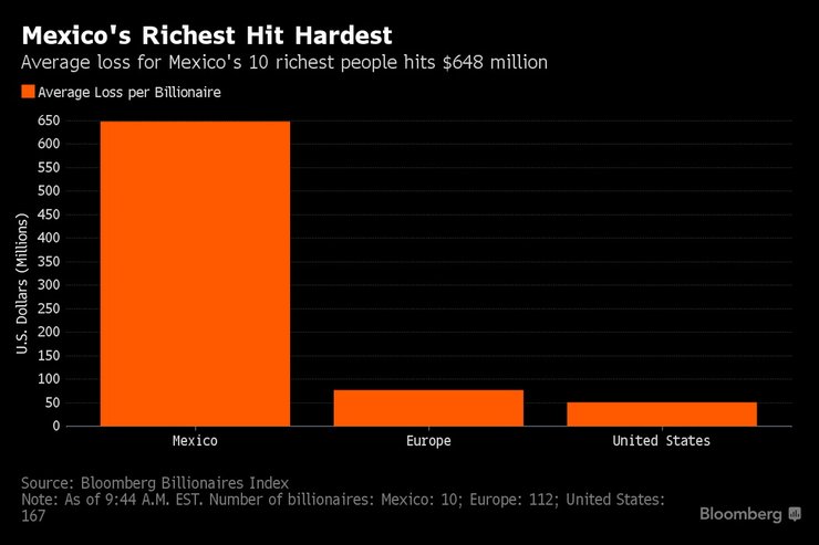 Больше всего потерял мексиканский магнат Карлос Слим: его активы упали в цене на 9,2%, что равнозначно потере $5,1 млрд. Кроме того, совокупное состояние других богачей Мексики сократилось еще на $6,5 млрд.