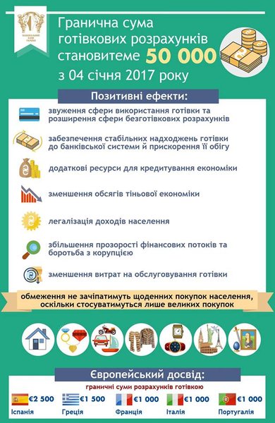 "Национальный банк Украины отмечает, что установление предельной суммы расчетов наличными на уровне 50 тыс. грн не причинит неудобств гражданам и не будет затрагивать ежедневных покупок населения, поскольку будет касаться только крупных приобретений (недвижимости, драгоценностей, транспортных средств, предметов искусства, меха, дорогих часов, путешествий и т.д.)", – заявляют в НБУ.