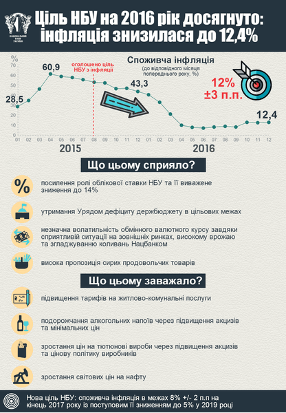 Напомним, инфляция в Украине в 2016 году (декабрь 2016 года к декабрю 2015 года) снизилась до 12,4% по сравнению с инфляцией 43,3% в 2015 году.