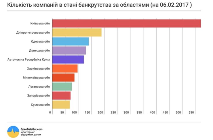 Лидером по количеству компаний, которые находятся в состоянии банкротства, стала Киевская область