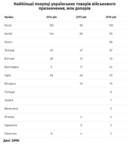 Согласно данным Стокгольмского института исследования проблем мира (SIPRI), в 2016 году Украина экспортировала в РФ продукцию военного назначения на $169 млн – больше, чем в какую-либо другую страну.
