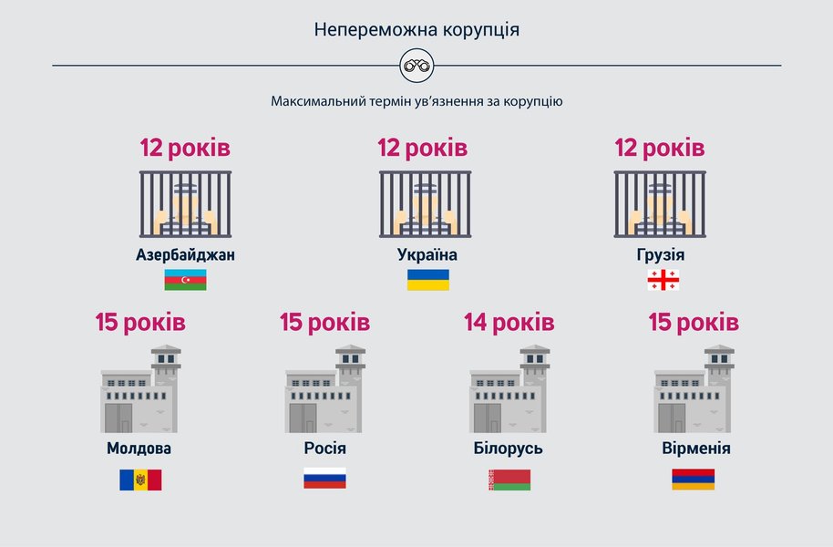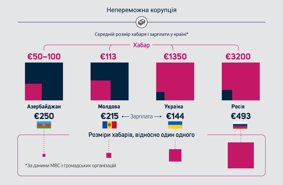 В Молдове взятка составляет 113 евро при зарплате 215 евро, а в Азербайджане взятка достигает 50-100 евро при средней зарплате 250 евро.