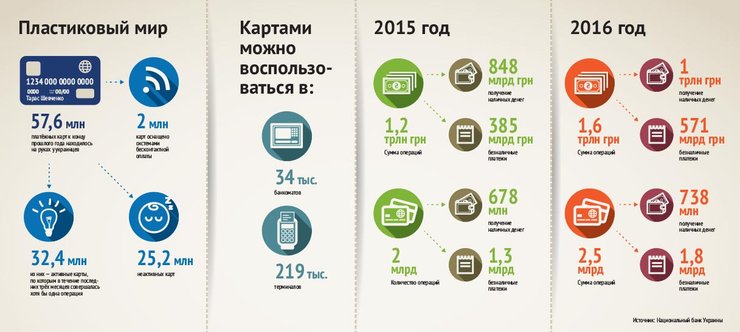 По данным НБУ, к концу 2016 года на руках у украинцев находилось 57,6 млн платежных карт. То есть на каждого из 35 млн жителей Украины старше 18 лет условно приходилось 1,6 пластиковой карты.