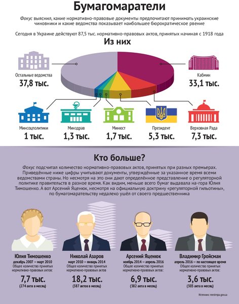 Украинский Кабмин регулярно проводит так называемые дни дерегуляции и чрезвычайно гордится отменой большого количества разрешительных документов. В середине марта, например, правительство с подачи офиса эффективного регулирования Минэкономразвития отменило сотню нормативных актов. Только вот отмена сотни не очень важных актов при общей зарегулированности правового поля напоминает анекдотичную акцию одного из московских застройщиков — "Купи квартиру и получи бейсболку в подарок". Простой пример: в Украине можно без проблем найти до сих пор действующие нормативы, принятые еще Совнаркомом в 1924 году. Всего же в стране действует более 87 тыс. нормативно-правовых актов.