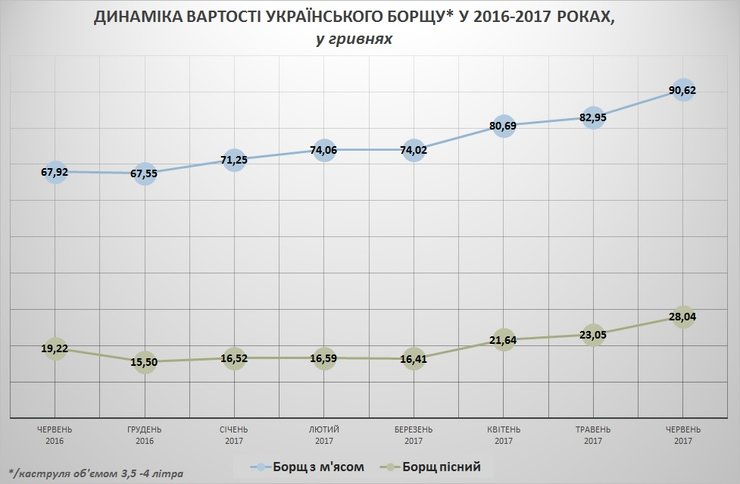 "По расчетам ЭДК, в июне 2017 года стоимость кастрюли украинского борща объемом 3,5-4 литра составляла: с мясом - 90,62 гривны, без мяса (постного) - 28,04 гривны. Таким образом, первый летний месяц ознаменовался существенным подорожанием стоимости приготовления украинского борща. Так, по сравнению с маем текущего года, в июне борщ с мясом подорожал на 9,2% ("плюс" 7,67 грн), постный - на 21,6% ("плюс" 4,99 грн)", - говорится в сообщении.