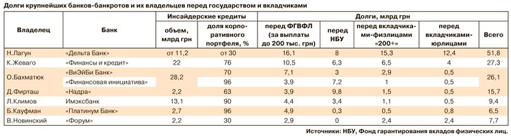 Среди наибольших должников - такие финучреждения, как Дельта-банк (общая сумма долга - 51,8 млрд грн, владелец - Николай Лагун), "Финансы и кредит" (совокупный долг - 27,3 млрд грн, владелец - Константин Жеваго), банки Олега Бахматюка ВиЭйби Банк и "Финансовая инициатива" (совокупный долг - 26,1 млрд грн), банк "Надра" Дмитрия Фирташа (общая сумма долга - 15,7 млрд грн), Имексбанк (владелец - Леонид Климов, долг - 9,4 млрд грн), Платинум банк Бориса Кауфмана (долг - 6,5 млрд грн), а также банк "Форум" Вадима Новинского (долг - 7,7 млрд грн).