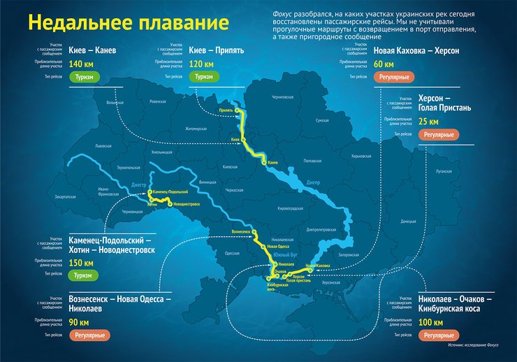 Туристическое судоходство в Украине прекратилось в 2014-м, после оккупации Крыма. Однако в этом году появился новый международный маршрут. 21 мая в Киев зашло круизное судно "Принцесса Днепра", которое возит туристов по маршруту Фетешти (Румыния) — Одесса — Николаев — Днепр — Киев. Это судно принадлежит украинской туристической компании "Червона Рута". До конца года планируется осуществить девять рейсов.