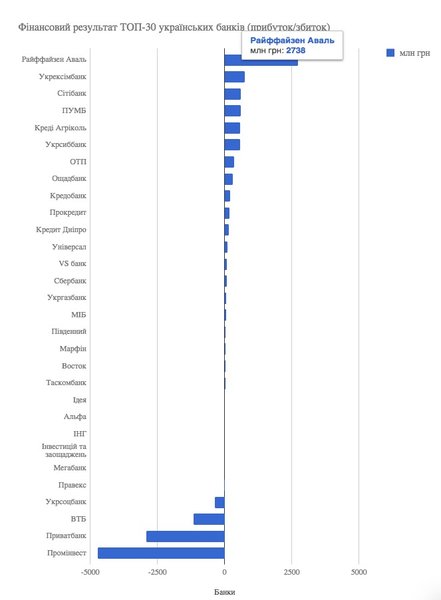 Наиболее убыточными украинскими банками стали Проминвестбанк (4,720 млрд грн), Приватбанк (2,908 млрд грн) и ВТБ (1,106 млрд грн).