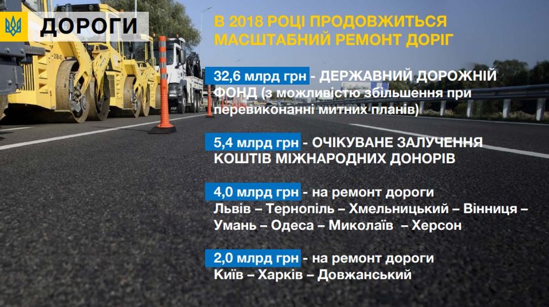 На дороги в 2018 году планируется выделить 44 млрд грн. Из них 4 млрд грн - на строительство магистрали "Львов - Тернополь-Хмельницкий -Винница - Умань - Одесса - Николаев - Херсон" и 2 млрд грн - на ремонт трассы "Киев - Харьков - Довжанский". По словам премьера, ремонт начнется, как только наступят хорошие погодные условия.