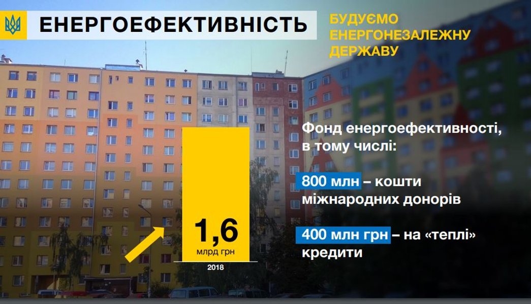 На Фонд энергоэффективности, который уже начинают финансировать международные партнеры, будет выделено 800 млн грн из бюджета. 400 млн грн будет выделено на "теплые кредиты".