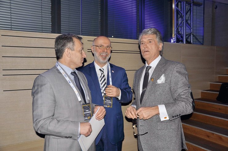 Приятная встреча. Гиви Топчишвили (слева) с главой Ассоциации налогоплательщиков Украины Григолом Катамадзе и третьим президентом страны Виктором Ющенко во время бизнес-форума Ukraine LEVEL UP
