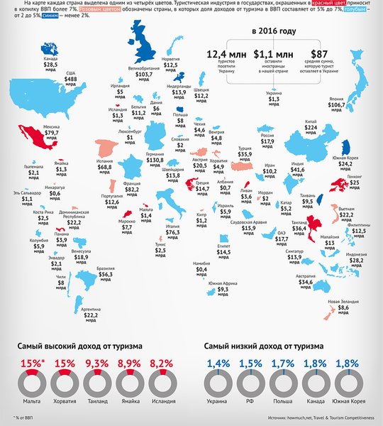 В 1950-х годах по миру путешествовало в среднем 25 млн человек в год. В 2016-м число туристов перевалило за 1 млрд. Туризм стал одним из драйверов мировой экономики. Совокупный вклад отрасли в общий ВВП составил $7,6 трлн. Фокус разобрался, сколько зарабатывают страны на понаехавших и кто больше всего нуждается в путешественниках.