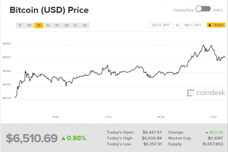 Цена на криптовалюту впервые достигла отметки в $6600. Об этом свидетельствуют данные CoinDesk, передает Экономическая правда.