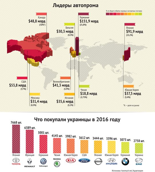 В 2016 году объем мирового автомобильного экспорта достиг $700 млрд. Это на 2,7% больше, чем в 2015 году, и на 7,1% выше, чем в 2012-м. Более половины доходов от экспорта авто приходится на европейские страны. Украины в списке лидеров нет