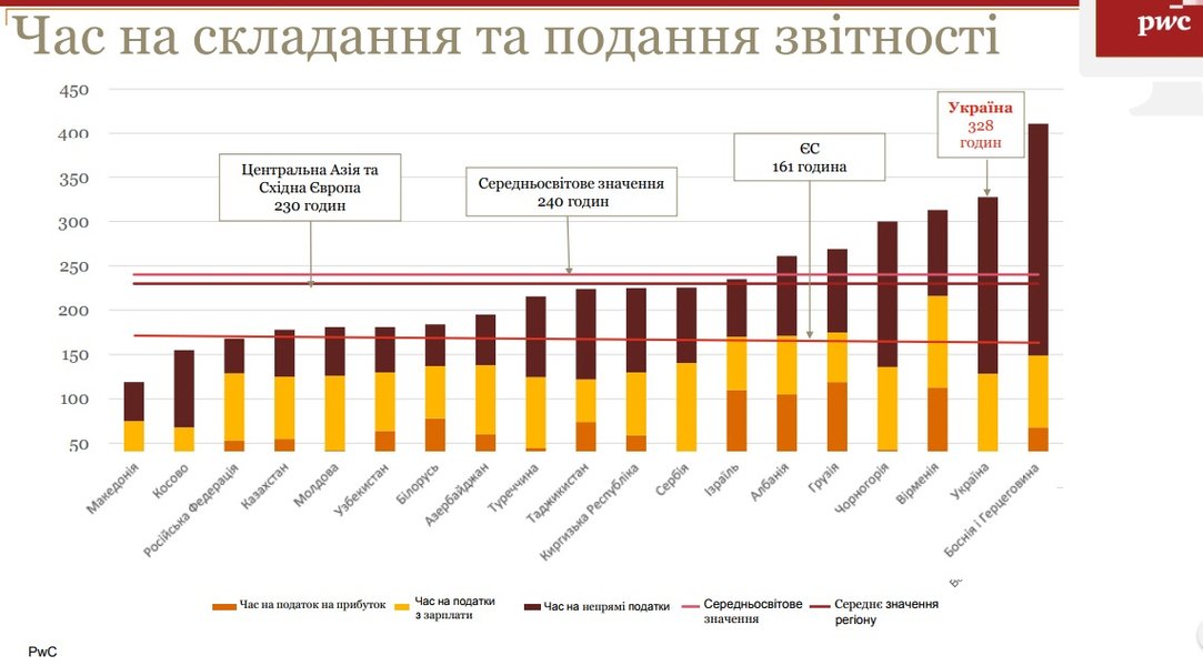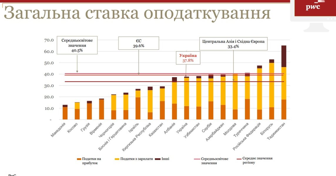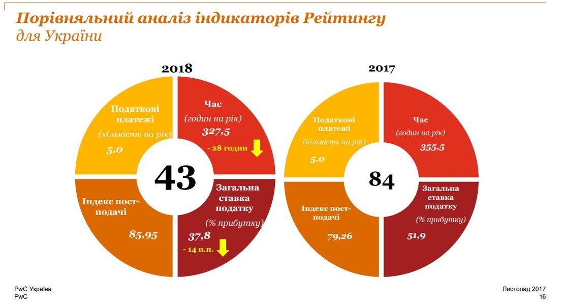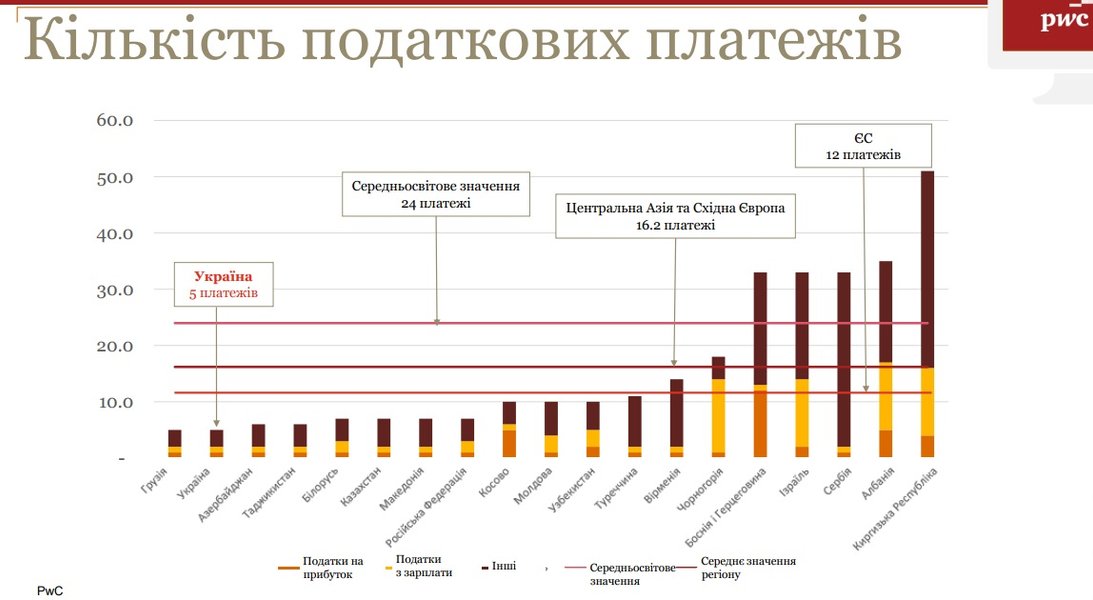 "Украина - единственная из стран Восточной Европы и Центральной Азии, которая в 2016 году существенно уменьшила налоговые ставки. В частности, уменьшение ставки ЕСВ привело к ослаблению налоговой нагрузки на бизнес. По сравнению с другими странами, в Украине относительно простые процедуры внесения исправлений в налоговые декларации и возмещения НДС не по экспортным операциям", - рассказал партнер компании "PwC Украина" Вячеслав Власов.