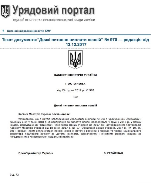 "Установить, что в целях обеспечения своевременной выплаты пенсий с учетом праздничных и выходных дней в январе 2018 г. финансирование и выплата пенсий проводится в декабре 2017 г. в рамках средств, предусмотренных бюджетом Пенсионного фонда Украины на 2017 год, утвержденным постановлением Кабинета министров Украины от 18 января 2017 года № 17 (Офіційний вісник України, 2017 р., № 10, ст. 301), лицам, которым выплачивается пенсия через их текущие счета в банках и через национального оператора почтовой связи по датам выплаты, определенным Пенсионным фондом Украины по согласованию с Министерством социальной политики", – говорится в постановлении.