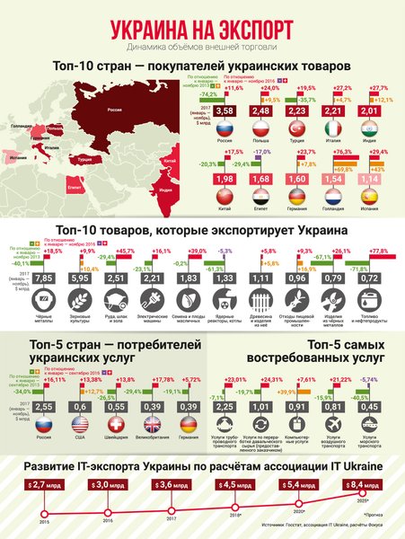 Несмотря на то, что экспорт в Россию после 2013 года сократился в разы, северный сосед все равно остается для Украины крупнейшим рынком сбыта — за 11 месяцев 2017-го туда поставили товаров на $3,58 млрд. В основном это черные металлы ($0,67 млрд), ядерные реакторы, котлы и машины ($0,59 млрд), химическая продукция ($0,45 млрд), металлоизделия ($0,2 млрд), бумага и картон ($0,17 млрд).