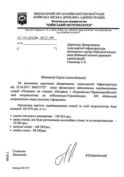 Об этом говорится в официальном ответе КП Киевский метрополитен директору департамента транспортной инфраструктуры Киевской горадминистрации Сергею Симонову, которую опубликовал в Фейсбук исследователь истории киевских переименований Стефан Машкевич.