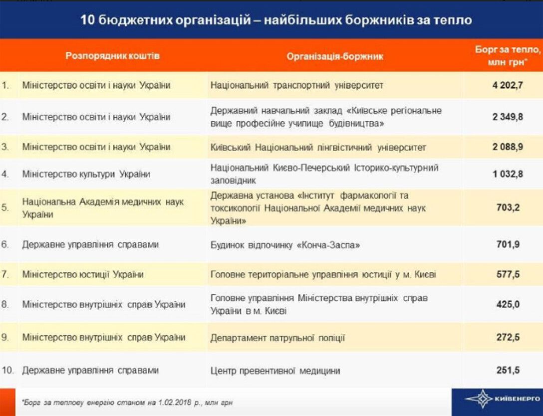 Главное территориальное управление юстиции в Киеве не оплатило почти 577 тысяч гривен за потребленное тепло, Главное управление МВД – 425 тысяч гривен, а Департамент патрульной полиции – 273 тысячи гривен.