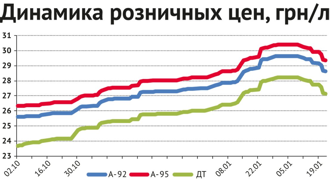 После значительного роста цен на топливо украинские сети АЗС впервые опустили цены во второй декаде февраля. Этому способствовало укрепление курса гривны и снижение цен на нефть. "В последние несколько недель мы наблюдали тенденции к некоторому укреплению гривны и снижению нефтяных котировок на мировых рынках. Соответственно, после того как к нам зашли партии нефтепродуктов по более дешевой цене, началось снижение цен на заправках", — отметил Васыль Дмытрив.