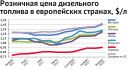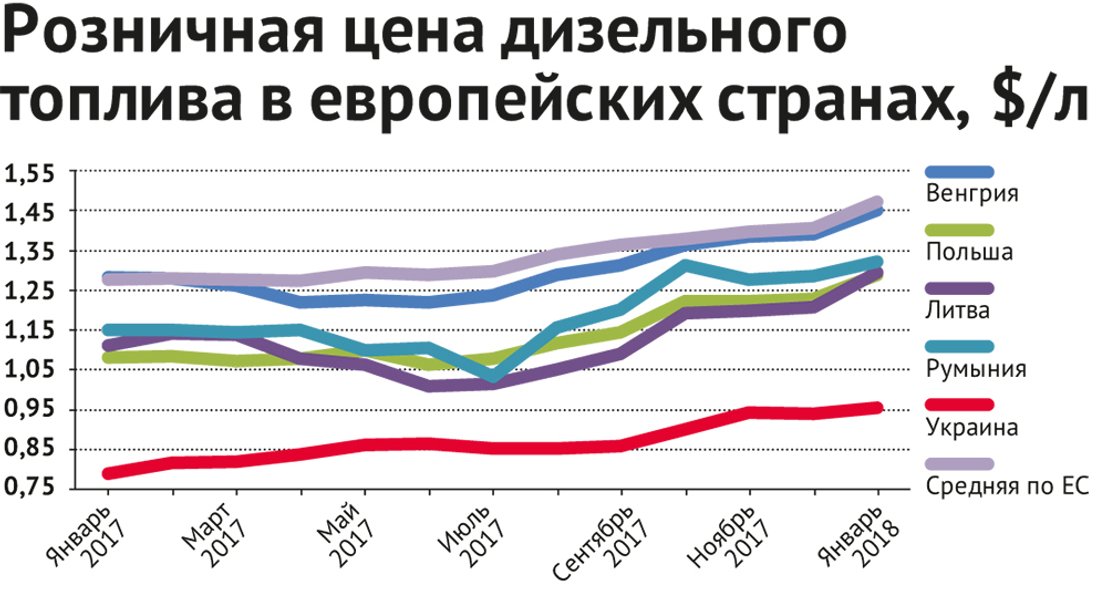 В отличие от украинского рынка, изменение цен на бензин в европейских странах зависит в основном от колебаний цен на нефть. Так, в период с октября 2017 года по февраль 2018-го дизельное топливо в Румынии подорожало на $0,03/л, в Польше — на $0,09/л, в Венгрии на $0,10/л, а в Литве — на $0,11/л. Для Украины этот показатель составил $0,23/л.