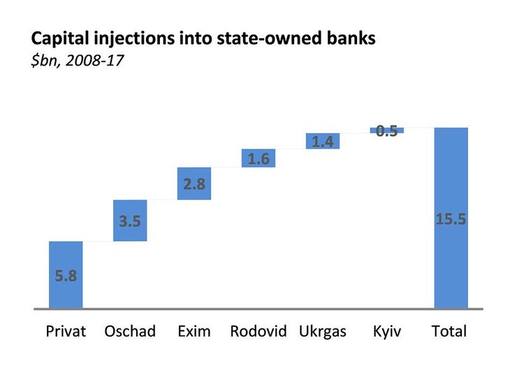 Украина с 2008 года вложила $5,5 миллиарда в поддержку своих госбанков, без учета расходов на финучреждения, переданные в Фонд гарантирования вкладов физлиц.