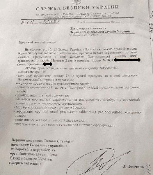 Об этом в понедельник, 25 июня, сообщает Обозреватель, опубликовав фотографию запроса, который СБУ направила в Житомирскую таможню.