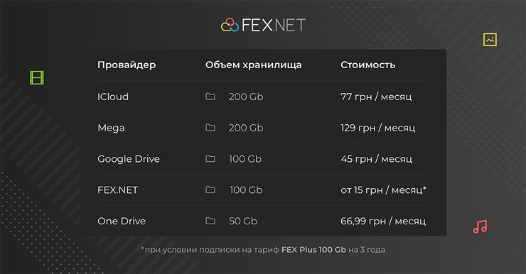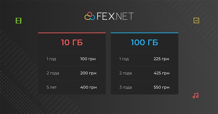 Подписку на 10 Гигабайт хранилища FEX.NET можно приобрести на срок от 1 до 5 лет, а премиум-подписка на 100 гигабайт доступна на срок от 1 до 3 лет. Стоимость подписки на месяц на 100 Гигабайт хранения стартует от 15 грн/месяц, при условии покупки премиум-подписки на 3 года, а стоимость подписки на 10 Гигабайт хранилища - от 6 грн/месяц, при условии покупки подписки на 5 лет.